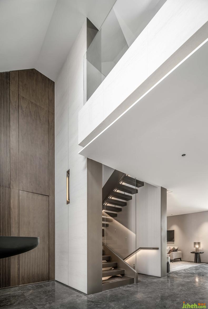 挑高的樓梯區(qū)將精致的生活格調(diào)層層鋪開(kāi),利落的線(xiàn)條伴隨暖色光線(xiàn)充盈其中,表達(dá)精致的空間訴求。金屬材質(zhì)的冰冷在人與人的連接中,帶來(lái)一絲暖意與高雅之感,串聯(lián)起室內(nèi)的情感主線(xiàn)。別墅裝修設(shè)計(jì)