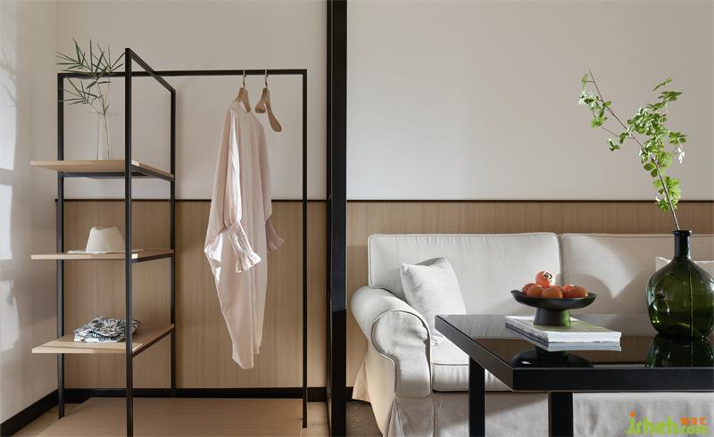 走道以利落的黑色線條對(duì)空間盡顯切割,運(yùn)用對(duì)稱美學(xué),既能穩(wěn)定空間結(jié)構(gòu),又給予空間空間寧?kù)o感,引入氛圍。