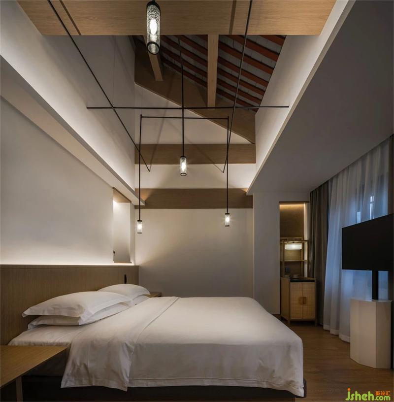 客房既有的瓦片坡屋頂及梁的仿古效果并不理想,有些拙劣,設(shè)計(jì)采用淺色橡木對(duì)梁柱進(jìn)行了新的裝著,梁柱之間的空間加入線形吊燈高低錯(cuò)落的排列達(dá)到弱化瓦片屋頂瑕疵的作用