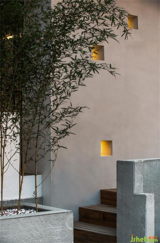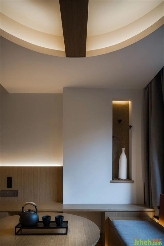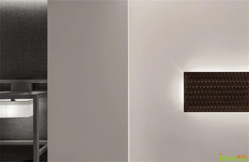 客房走道結(jié)合現(xiàn)有的建筑墻體形態(tài),通過凹凸形體的構(gòu)成關(guān)系,運用藤編和燈光的組合,營造除質(zhì)樸且細膩的通道氛圍。