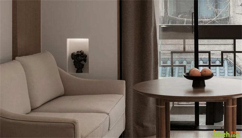 客房室內(nèi)空間造型運營幾何手法進行切割,簡潔利落。通過光滑的白色涂料和質(zhì)樸編織墻布形成對比帶來視覺上的賞心悅目。