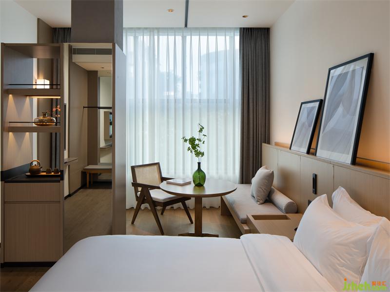 幾何是抽象、擁有無限可能性的元素單位。酒店設計幾何的線條在立面組合,不同的肌理產(chǎn)生對比,賦予建筑簡潔明朗的幾何之美。從建筑的立面延伸至內(nèi)部空間,錯落的幾何關(guān)系在形與形之間回應著一種輕松的連接與分布邏輯,簡單的形體在小空間內(nèi)創(chuàng)造空間啟與承,如此輕盈,輕快明朗。