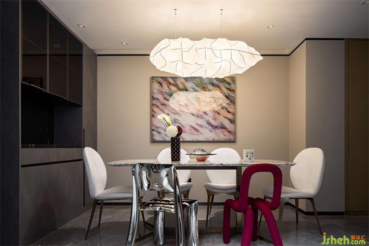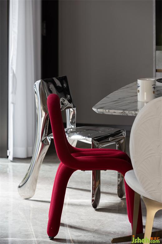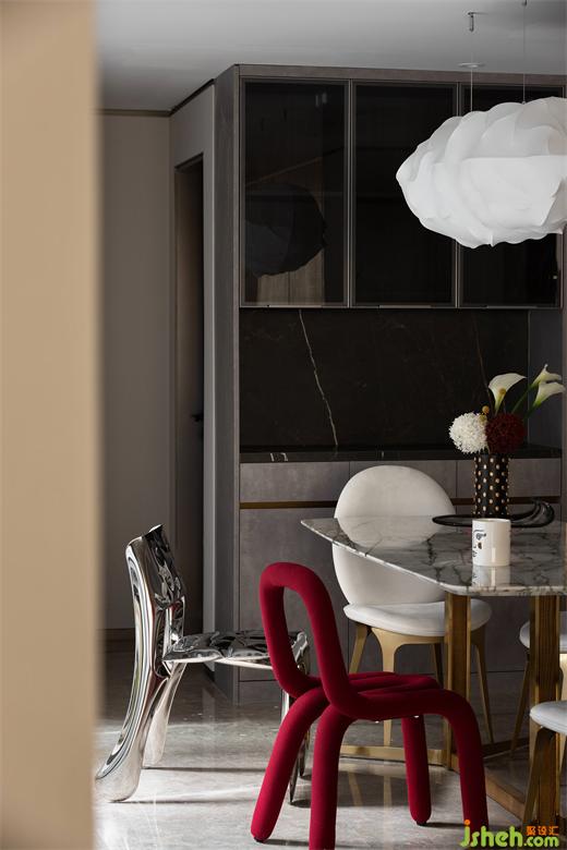 紅色和不銹鋼材質(zhì)的餐椅組合,中海望京府復(fù)式家裝設(shè)計(jì)營造了集品質(zhì)、藝術(shù)、舒適為一體的輕奢生活方式。一餐一食,一酌一飲,一家人圍著餐桌享受美食,偶爾伴隨幾句嬉笑,繪就了一幅幸福美滿的和諧畫面。