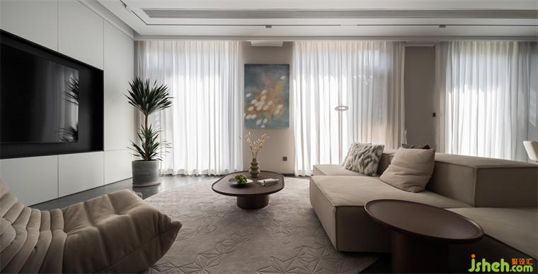 橢圓形的茶幾顯得品質(zhì)有格調(diào),映襯著地毯的紋理感,延伸到墻面掛著的日光藝術(shù)畫,讓空間靈動而不呆板,一入室便被吸引。