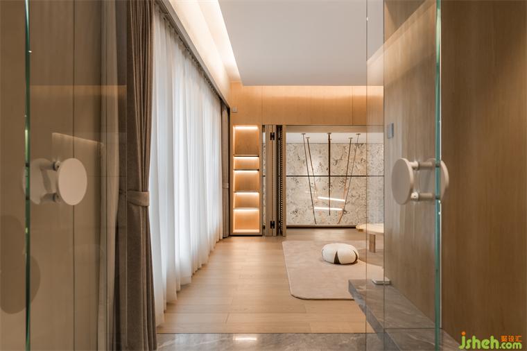 一層入目增加了開放的休閑娛樂區(qū),讓過渡空間充滿了想象,柜體細節(jié)處燈光設(shè)計,留白轉(zhuǎn)折拉開層次,或坐或躺也是自在其中。挑空之下,流線型吊燈輕垂錯落有致,大理石肌理垂直蔓延,在這里,場景交織下,互動重塑空間意趣。