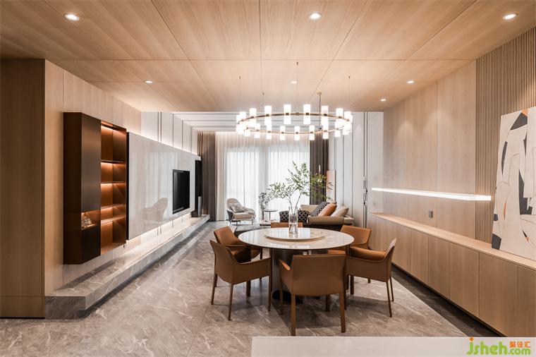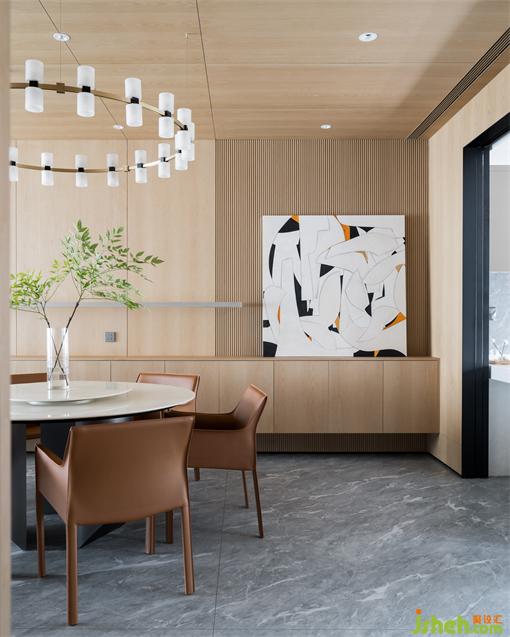 一層客餐廳空間開闊雅致,糅合著秩序節(jié)奏與空靈飄逸感,人隨境而轉(zhuǎn),舒適感極佳。富有層次感的色彩搭配度獨到的空間裁切、雅致的家裝鋪陳,都彰顯著匠心與考究。沒有過多莊重的設(shè)計,獨特的裝飾畫、精美的吊燈和別致的植物,為餐廳增添了一份獨特的氛圍和個性化的魅力。在光影之下盛放靜謐如畫,演繹著一家人三餐四季的浪漫生活。