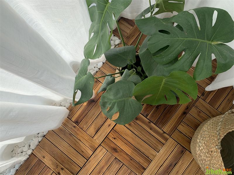 陽臺再小也要有收納及顏值的存在.陽臺鋪設戶外木,搭配小鵝暖石;