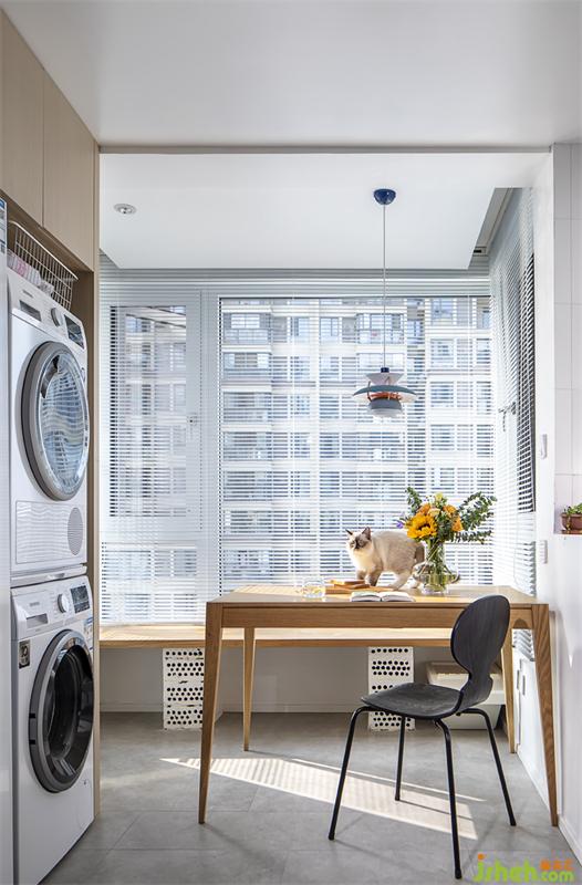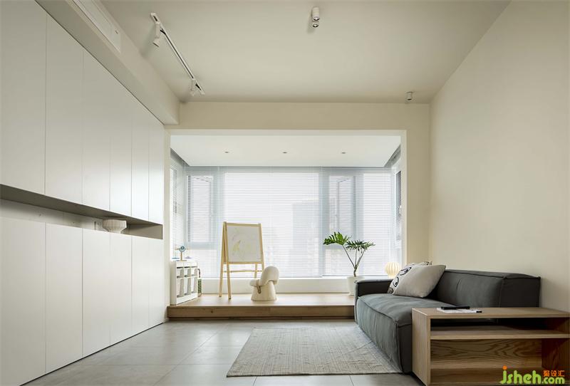 1:利用小陽臺的外墻裙結(jié)構(gòu)高度45公分,定制榆木板+蜂窩磚的力學(xué)結(jié)構(gòu)形成小的卡座休閑區(qū)。