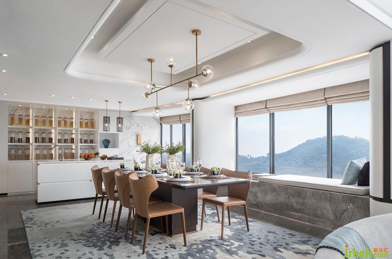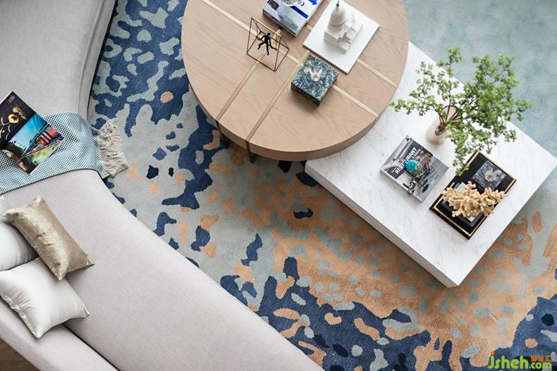 不規(guī)則的家具和藝術(shù)品于此巧妙邂逅,在比例、情緒和故事間平衡出了自由生動的韻味,處處貫穿恬逸和諧。優(yōu)美的沙發(fā)弧線,木質(zhì)與理石拼接的茶幾構(gòu)造,搭配浪花般活潑的地毯,色彩跳躍的布藝軟裝從客廳蜿蜒至餐廳,可謂到處皆意境,隨時有物華,設(shè)計公司為空間增添耐人尋味的藝術(shù)內(nèi)涵,引發(fā)海灣生活方式的無限思考與探索。