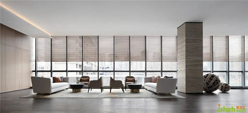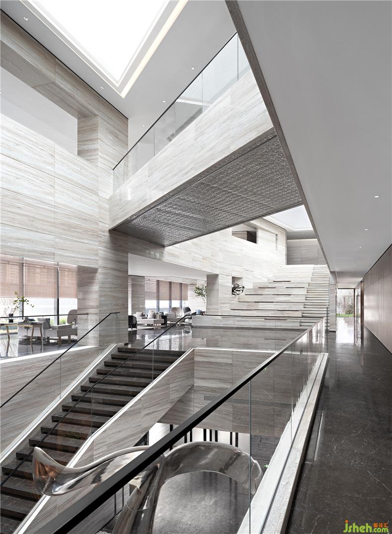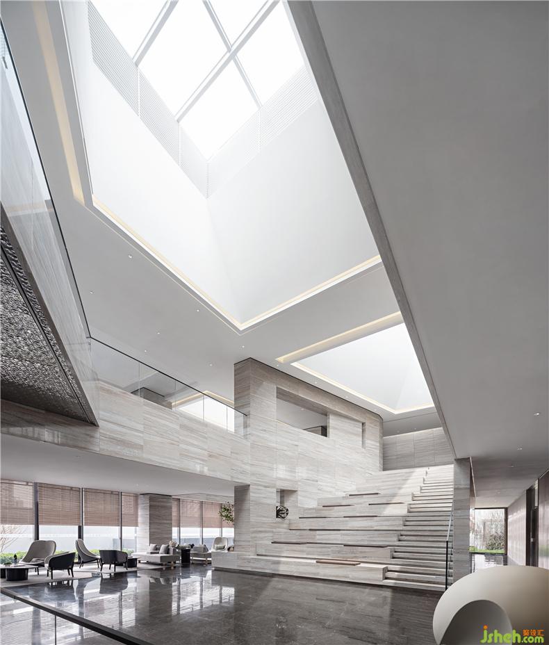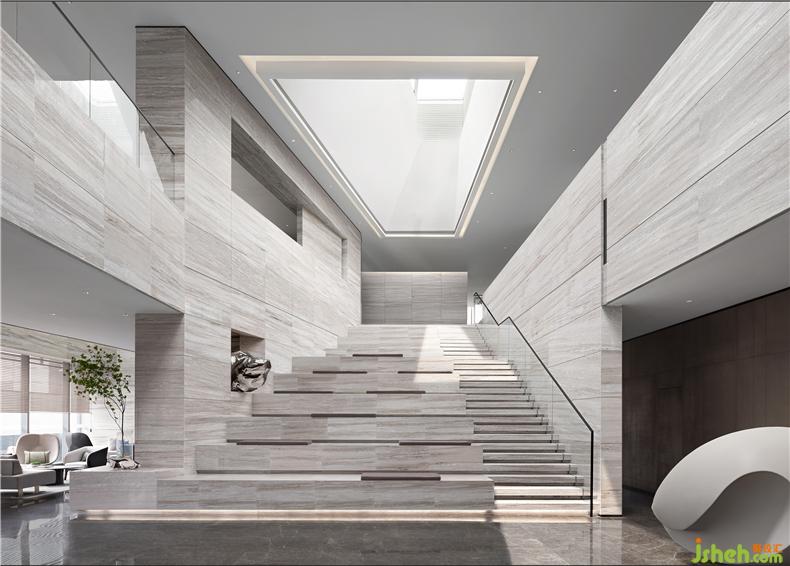 光從天頂灑下,中庭的天光階梯成了最亮眼的存在,青島會(huì)所設(shè)計(jì)層高達(dá)10米的共享空間,木紋大理石從墻面蔓延至臺(tái)階,其中鑲嵌雕塑點(diǎn)綴,形如靜謐、安然的“歸巢”,成為空間的精神象征,為空間注入藝術(shù)感,無(wú)形中拉近人與人的關(guān)系。