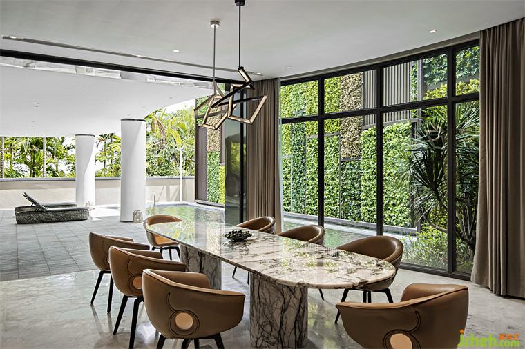 社交中空客廳、西式餐吧、私人影院、酒窖、健身室等功能圍繞著露天泳池展開,各空間之間沒有明顯的界限,彼此形成通暢的流動,不同生活場景自由切換。