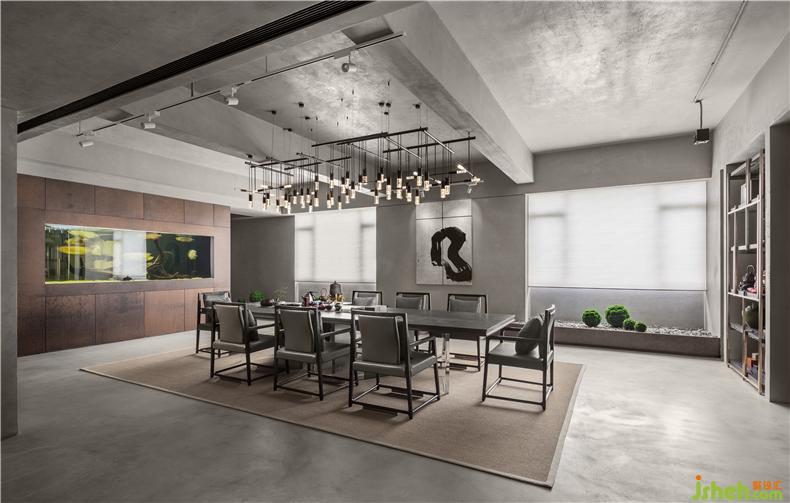 門(mén)廳通過(guò)銅管編織的立體裝置,引導(dǎo)進(jìn)入會(huì)所空間,同樣的灰色墻壁,這個(gè)空間選擇了深灰色,增加了視覺(jué)延伸感,打破了灰色的單調(diào),豐富了空間層次。