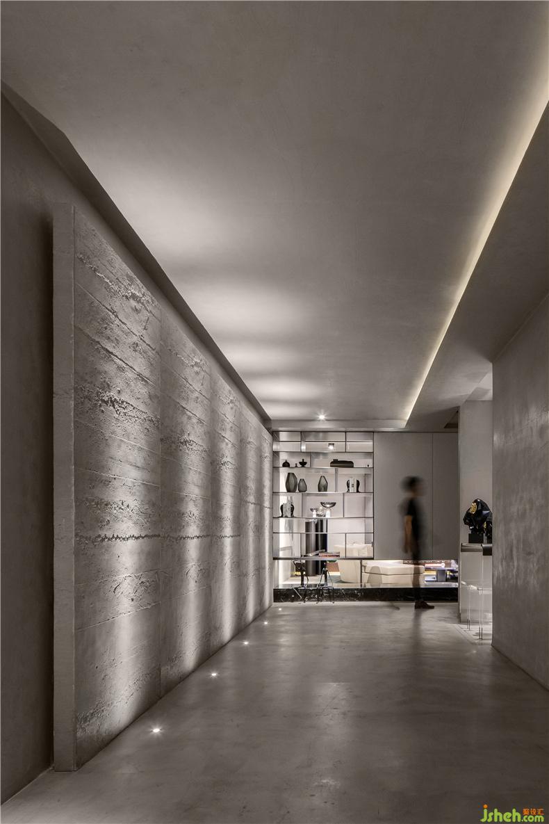 過(guò)道是臥室與客廳的承上啟下的空間,為了減弱灰色帶來(lái)的乏味,會(huì)所設(shè)計(jì)利用地?zé)舻墓庥埃蛟斐领o內(nèi)斂的空間環(huán)境。