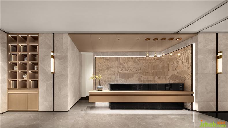 接待處作為整體“場所”的入口,協(xié)調(diào)空間整體的一致性,樣板房設計方正簡明將各功能區(qū)進行勾勒劃分。大面積材質(zhì)鋪陳與去裝飾化明確了空間的節(jié)奏韻律,前臺背景雕塑構(gòu)成了文化底蘊輸出的情感鏈接點,隱約雀躍著深圳這座城市歷史文化和山水之間的聯(lián)系。