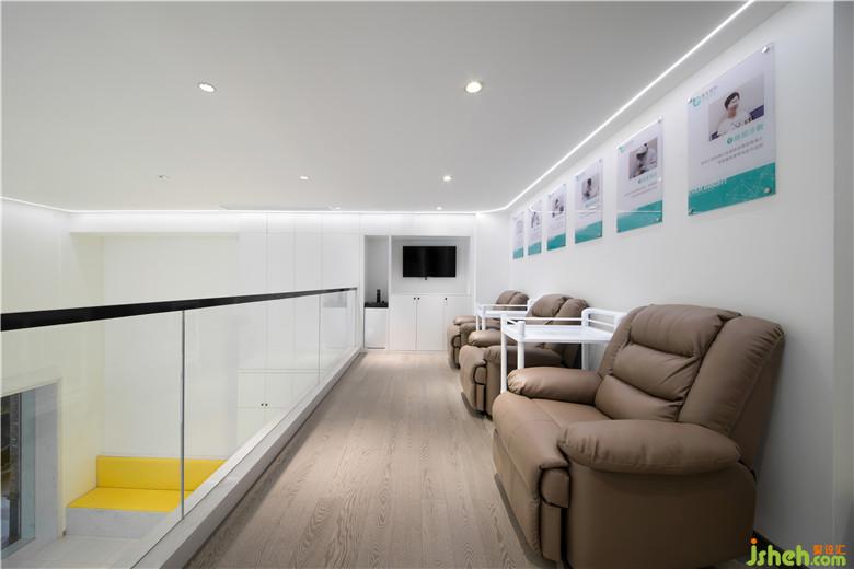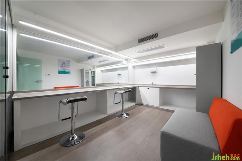 室內(nèi)設(shè)計(jì)師盡量精簡logo在墻上的尺度,不傳遞出過分的商業(yè)氣氛。而前臺區(qū)域也盡量傳遞輕松、平等的態(tài)度。至少從入口開始,這就是一個(gè)友好的空間,一個(gè)溫暖的診室。