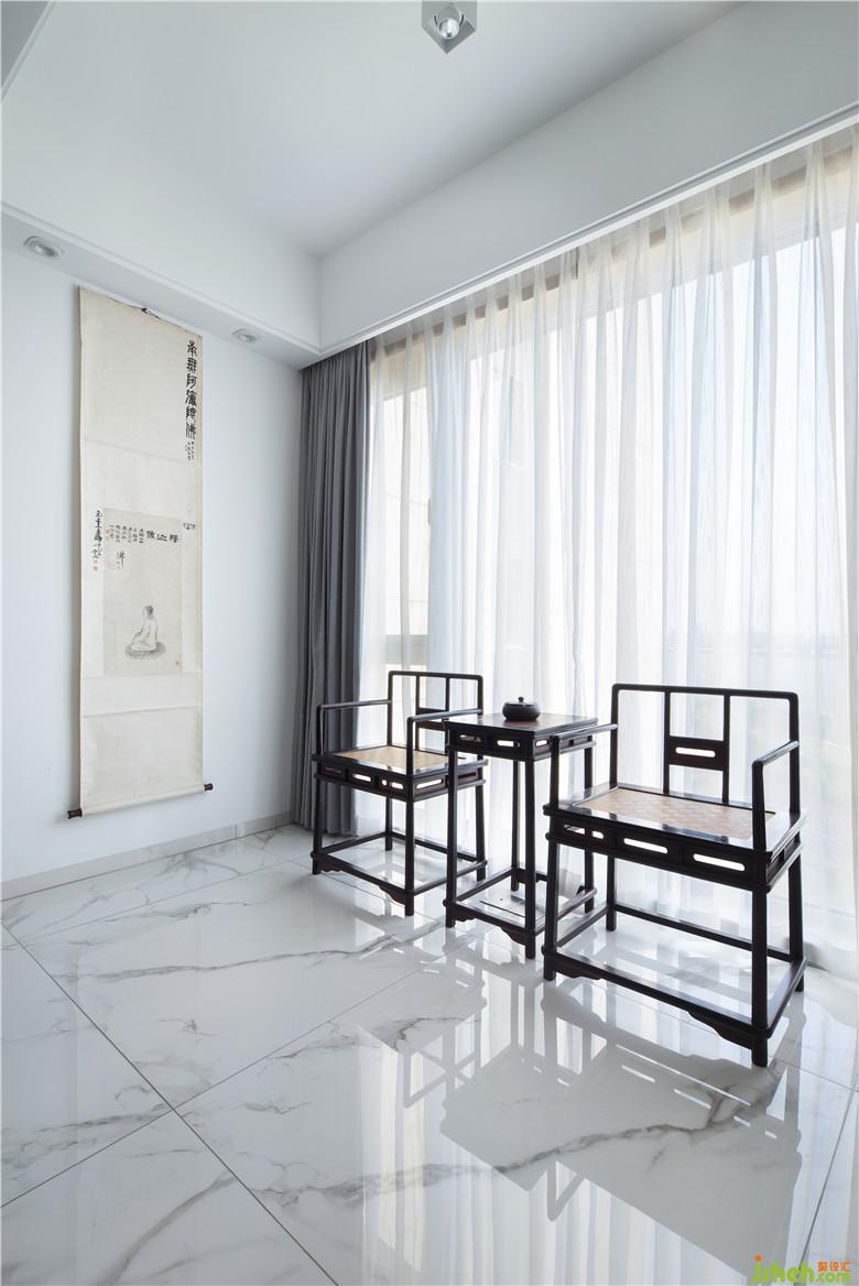 于窗邊置一桌椅,沏上一壺茶。室內(nèi)是字畫的藝術(shù)氣息,窗外是江景的自然美景,愜意十分。