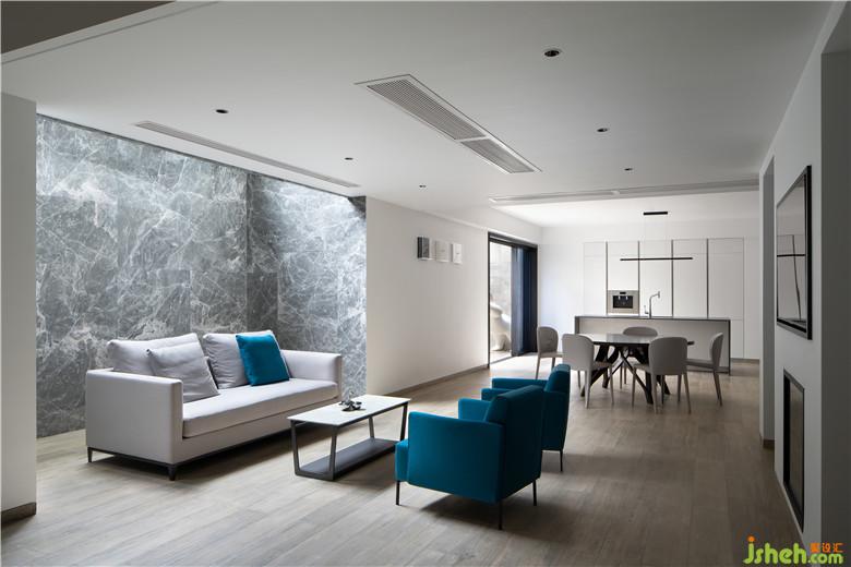 色彩上,藍(lán)色的加入,與整體的灰白色調(diào)共同營造出輕奢的質(zhì)感。