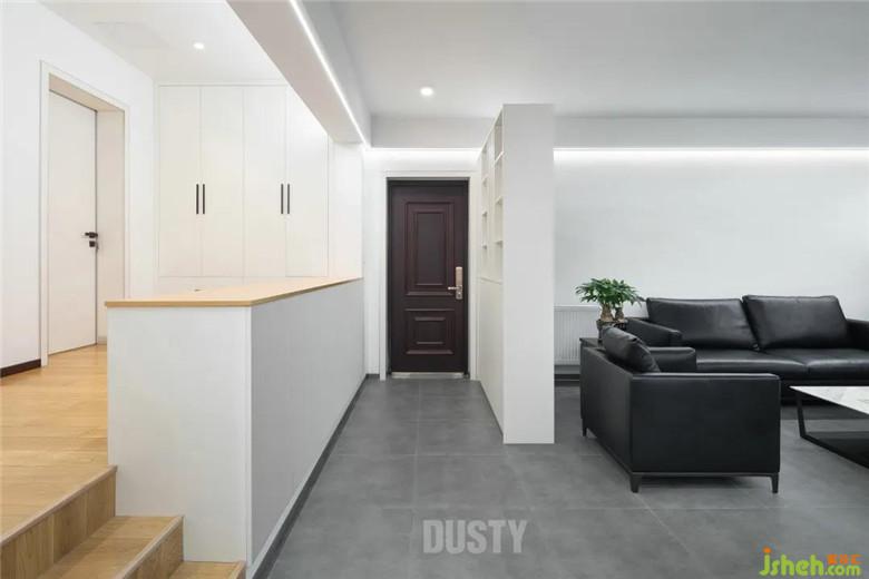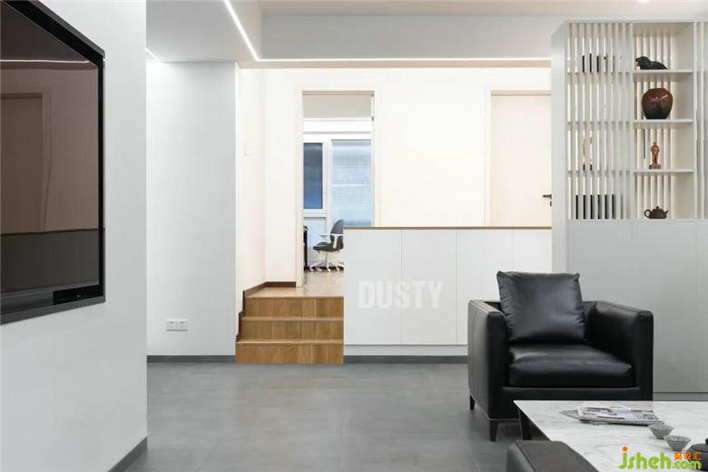 裝修公司利用錯(cuò)層高差,形成休閑空間。墻面做成收納柜,而原本的錯(cuò)層欄桿變身為一組矮柜,成為了新的擁有收納功能的“欄桿”。