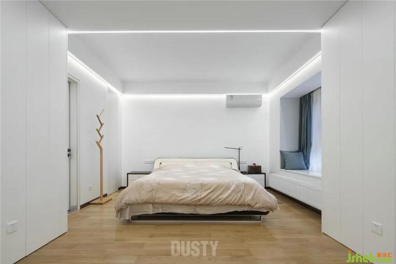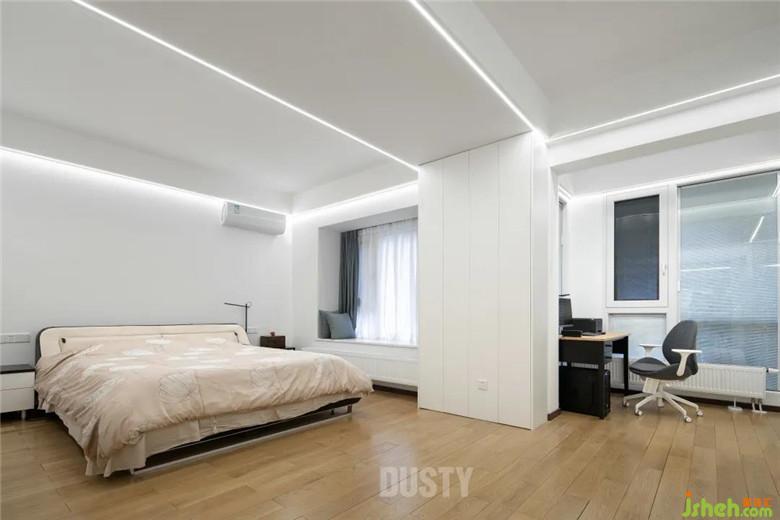 主臥房門裝修公司改為朝向客廳,使之南北空氣形成對流。整個空間無多余的造型,滿墻衣柜從地到頂無接縫,空間得到最大釋放,收納功能做到最大化。