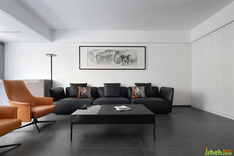 我們將整體的色調(diào)定為白色,質(zhì)感又寧靜。一盞吊扇燈,增添許多生活的氣息。家裝設(shè)計(jì)桔色單人椅配上黑色的沙發(fā)和灰色地板,高級(jí)感撲面而來。地面與立面使用相似色調(diào)統(tǒng)一質(zhì)感,空間深度、廣度得以延伸。
