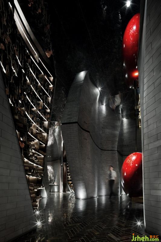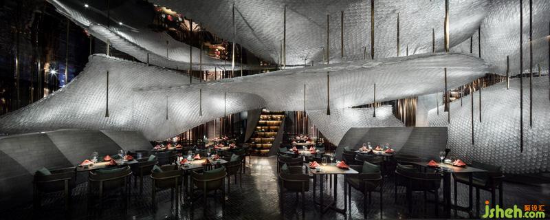 宋·川菜用現(xiàn)代的材料與設(shè)計(jì)手法來演繹的中式餐廳,十萬塊異形的不銹鋼磚與四十萬塊琉璃羽毛構(gòu)成宋餐廳的基本形態(tài)。曲面的形態(tài)打破了一貫的中式餐廳的想象,形成獨(dú)特的空間體驗(yàn)。
