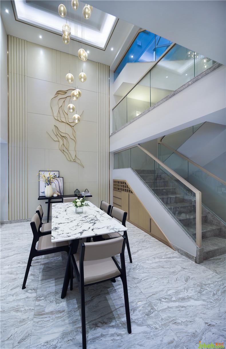 空間設(shè)計(jì)理念上主張用豎線條來(lái)切分過(guò)于矮、扁、寬的立面空間,拉升層高;有規(guī)律的弧形豎條 作為間隔,兩種線條的碰撞讓整體空間既規(guī)整、利落而又不顯呆板。材質(zhì)上選擇皮質(zhì)硬包及金屬線條,精細(xì)工藝為其特征,強(qiáng)調(diào)品質(zhì)感及細(xì)節(jié)的處理??臻g搭配上突出硬裝到軟裝的元素延伸,比如地板磚面的水墨質(zhì)感的律動(dòng),客廳裝飾畫(huà)里的蜿蜒曲線,挑空餐廳背景的鐵藝裝飾掛件呈現(xiàn)的不規(guī)則弧線的相交等等細(xì)節(jié)都強(qiáng)烈?guī)С隹臻g整體的調(diào)性,不為裝飾而裝飾,所有的都是恰到好處的點(diǎn)綴,營(yíng)造的空間氛圍是非常突出和自然的。
