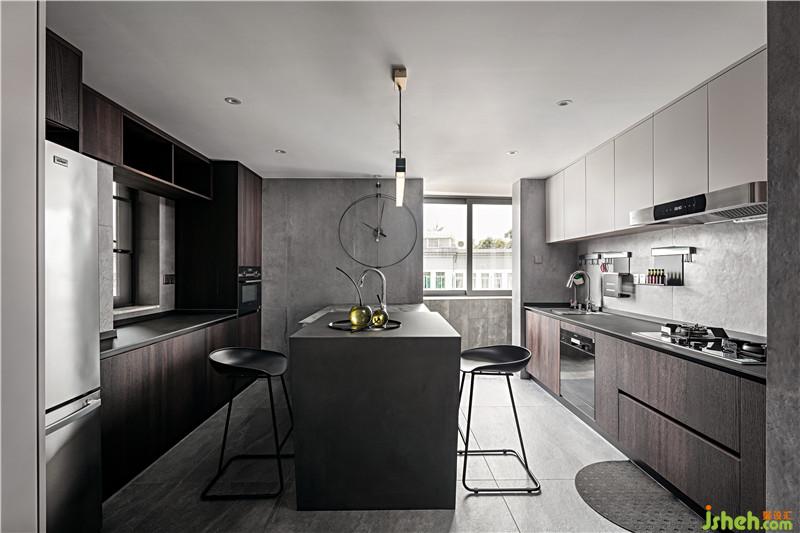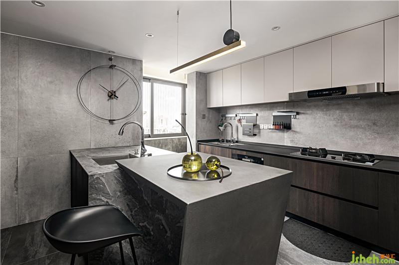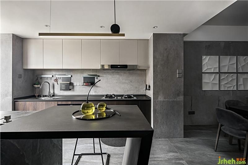灰色從客廳貫徹到廚房——意大利LAMINA太空黑至純廚臺,以及意大利LAMINA銀豹洗手臺,還有水泥灰大磚墻等營造出廚房工業(yè)風粗糙厚重的質(zhì)感,整個空間的氣質(zhì)——藝術(shù)、帥氣、野性。