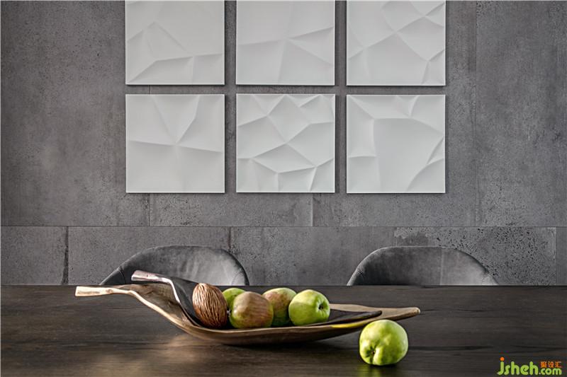 餐廳與客廳銜接,空間關(guān)系一目了然。整體空間層高2.7M,裝了中央空調(diào)后為2.4M。為了在視覺效果上拉伸層高,避免空間局促,餐廳主墻與地磚都是采用1500*700CM的大磚錯縫鋪貼。