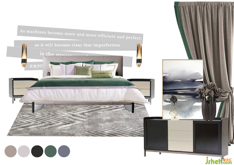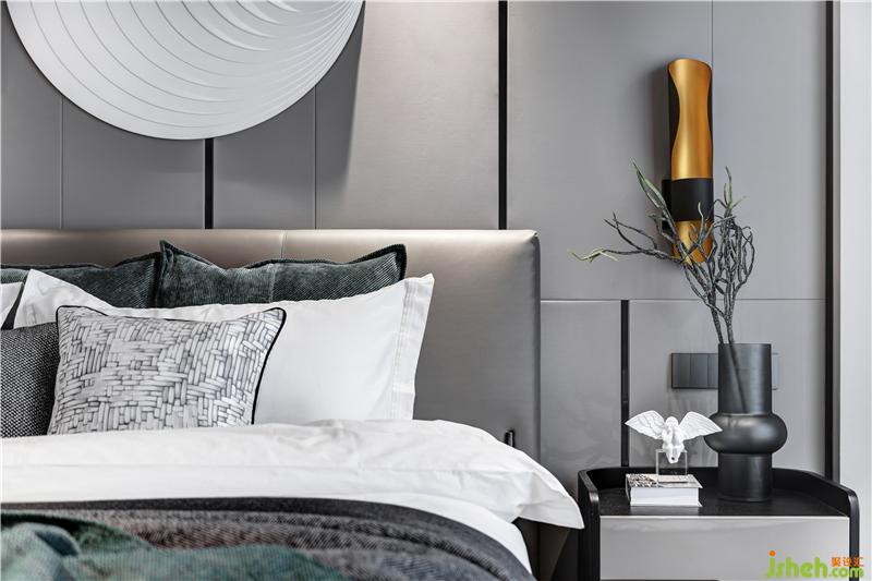臥室恬靜溫潤的氣質(zhì),在高級灰背景里,映襯著一泓湖綠,讓人陷入柔軟舒適里感受一切令人歡喜的事物。