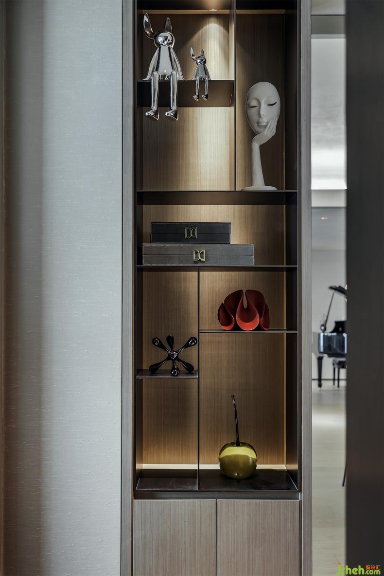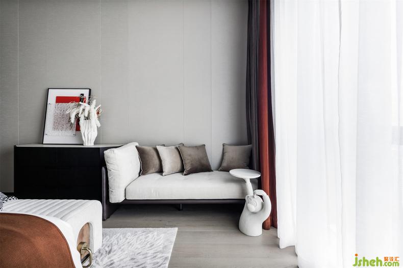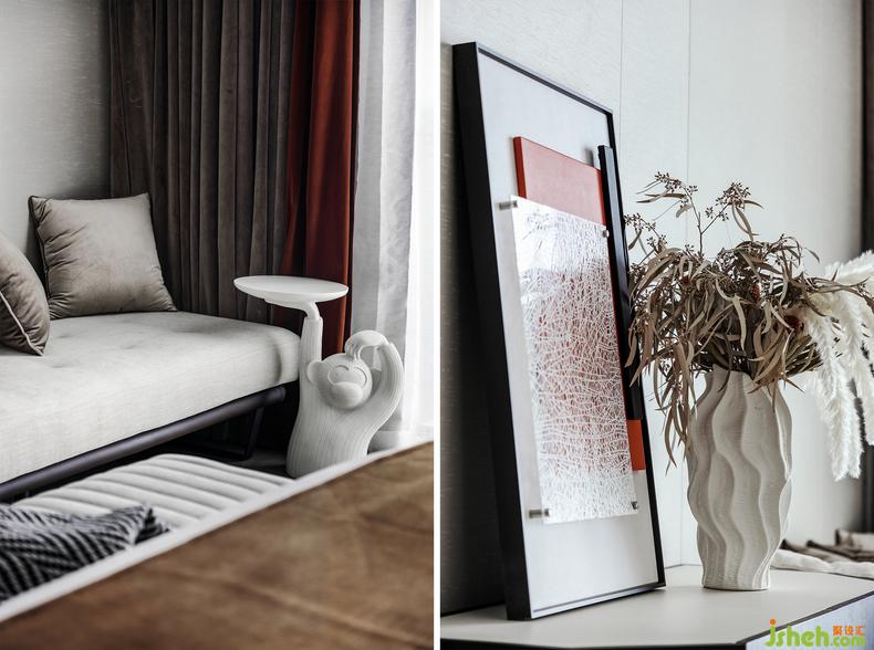 在溫暖柔軟中又加入一些金屬元素,且形狀正好落在地毯圖形上,象征著花開既永恒的優(yōu)雅;邊幾上裝飾一花一畫,以流動(dòng)的紋理對照有序的邊界,波動(dòng)情緒深處,慰藉心靈。