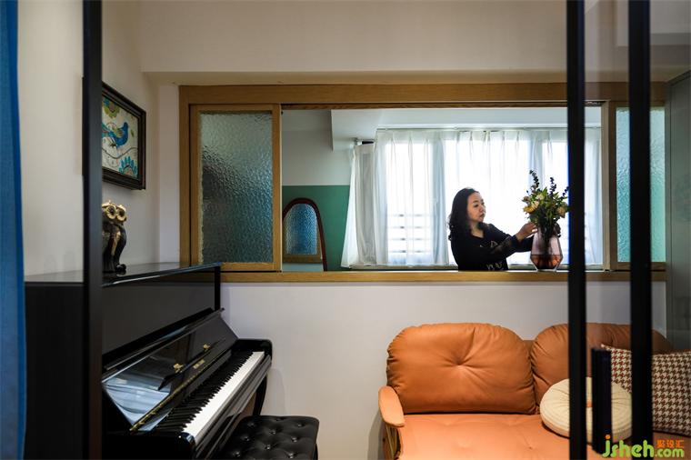 這個(gè)空間以前是客臥,沒(méi)有光線,通風(fēng)不好,現(xiàn)在改成半開(kāi)放的琴房,木框窗從兩面看,都像是把空間裝在了一幅畫里:《插花的女主人》、《練琴的孩子》,有時(shí)候發(fā)呆、閱讀、休息,極具包容性和互動(dòng)感。