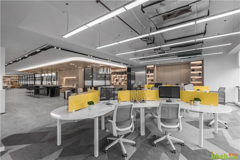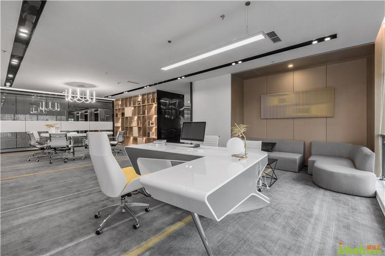 公共辦公區(qū)的設計,現(xiàn)代辦公桌的線狀與色調帶來強烈的視覺沖擊,辦公室設計線燈方格置物架以小型圖書角的姿態(tài)靜立在窗邊一隅,皆是推動人們高效工作的氛圍助力,科技感與未來感達到了統(tǒng)一。