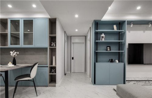 在方案設計的初稿階段,為了做出貼近她生活的設計,她請我參觀她現(xiàn)在的家,小小的廚房里,各種設備齊全,烤箱、咖啡機、煎牛排的機器、料理機,一個十足的設備控。她跟我聊著她的咖啡,“曼特寧”“手沖壺”“悶煮器”!她請我品嘗了她親手煎的牛排,配上自己調的醬汁,哇喔,十足的美味。她對料理設備的要求和對美食創(chuàng)作的興趣,也讓我牟足了勁,跟原始戶型的布局狠狠的較量一下!我把原本離得較遠的廚房和餐廳,“揉”在了一起,變成了她的美食天地!特意為其量身定制了2.4米長的餐桌操作臺,配以放置料理設備的高柜,讓這里成為美食誕生的搖籃!
