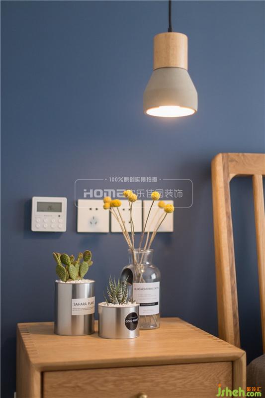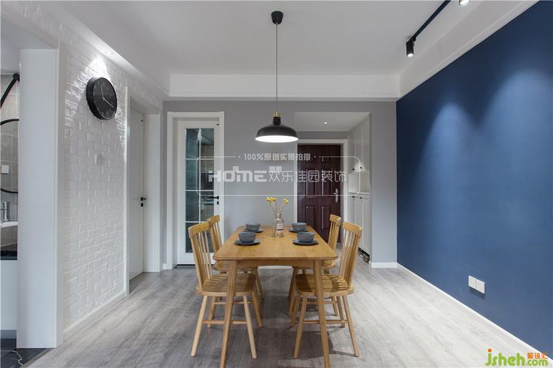 清新純凈的餐廳空間,室內設計師延續(xù)了客廳自然簡約的風格,一面藍、兩面灰和白、三點黑重組的空間,因造型簡單的原木色餐桌椅的加入,更具自然氣息。