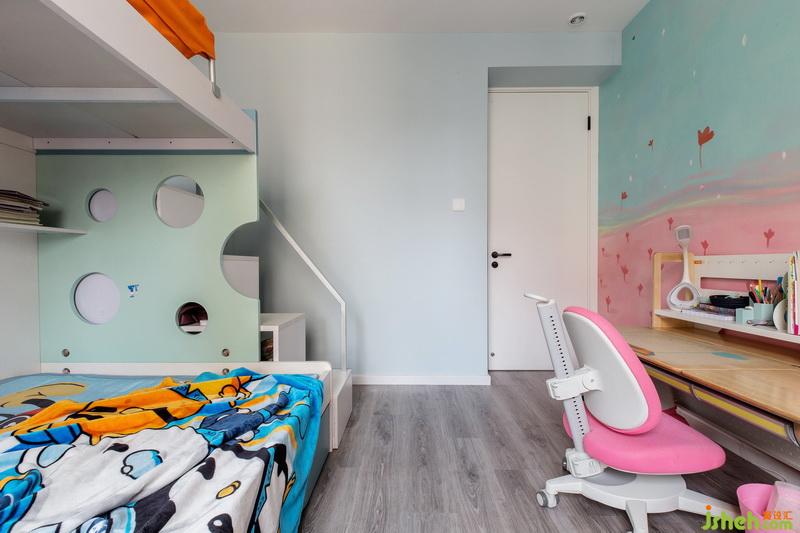 因為家里是兩個小公舉,所以室內設計師在色彩的搭配上,室內設計師選用的是粉紅、淡藍色,活潑鮮艷,簡潔明快,具有童話的意境。室內光線充足,簡單實用的書桌和儲物柜,讓兒童在自己的小天地里自由的學習生活。