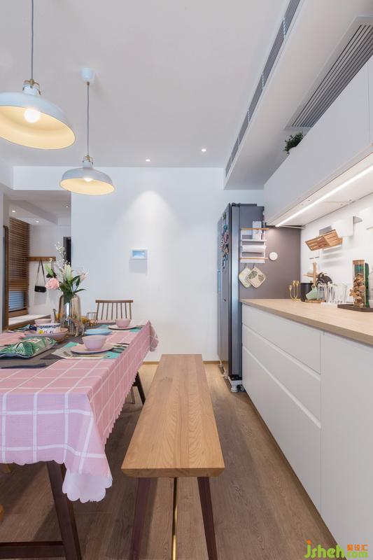 踏入餐廳,暖色的燈光,原木的桌椅,搭載粉色系的餐具,瞬間提升家居亮度,裝點(diǎn)出生活的小驚喜;輔以簡約白色吊燈,讓人恍惚之間有到了愛琴海邊的錯(cuò)覺,滿屋浪漫。