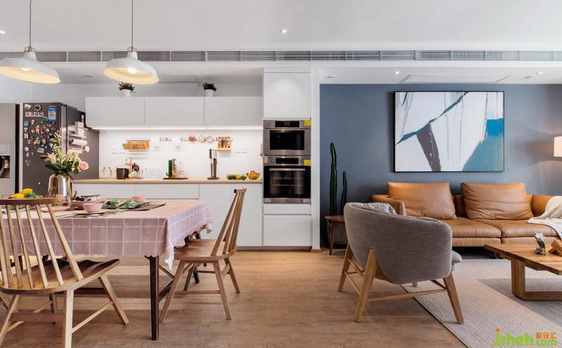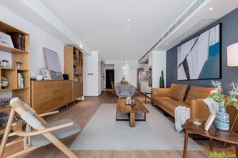 室內(nèi)設(shè)計(jì)師在客廳里每一個(gè)角落都是經(jīng)過精心布置的,家人希望給孩子成長的陪伴和空間,所以沒有電視柜的設(shè)計(jì);棕色皮質(zhì)沙發(fā)搭配原木色的茶幾,大象灰的背景板輔以一副現(xiàn)代簡約抽象畫,色彩對比鮮明,空間層次感十足。