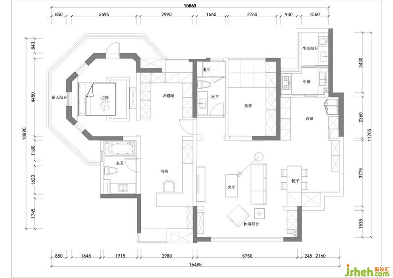 4、把原有獨(dú)立的3個(gè)臥室改造、合并成獨(dú)立書房、衣帽間、就寢區(qū)的大套房空間。