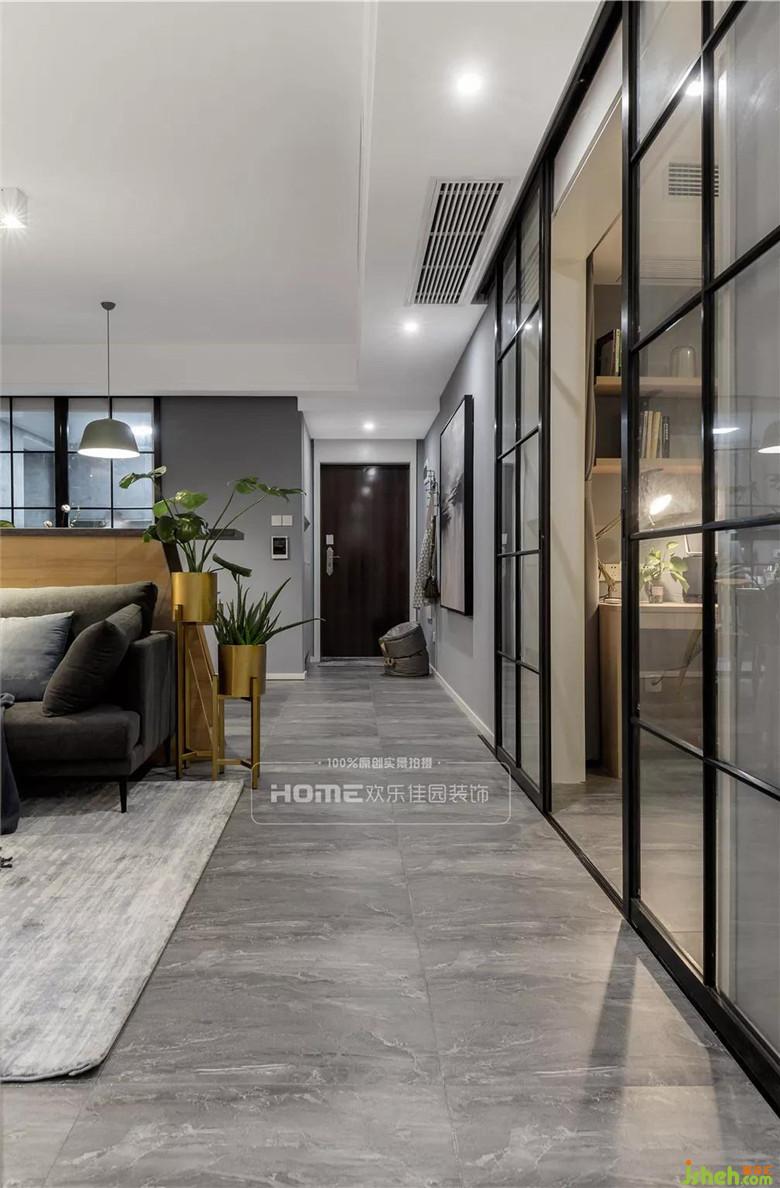 將客廳旁邊的房間隔墻拆除,使得進(jìn)入室內(nèi)空間的采光和通風(fēng)到達(dá)最佳效果,設(shè)計外掛的雙推黑框門,緩解過于常規(guī)的過道墻面,增加空間的連貫性與延續(xù)性。