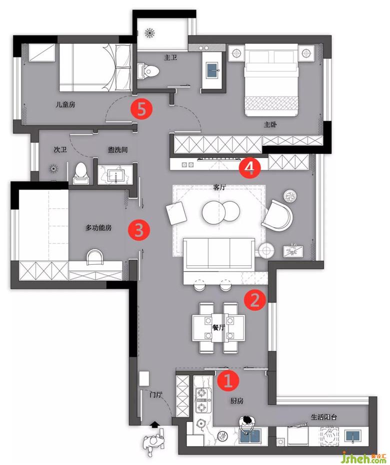 加寬廚房門洞,設(shè)計成外掛于頂?shù)碾p推玻璃門,并以此定義空間功能,門內(nèi)吳先生柴米油鹽,門外吳太太琴棋書畫。