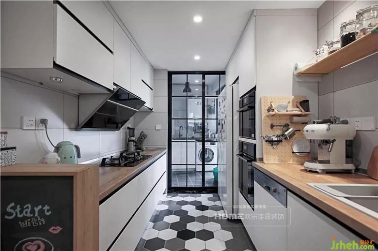 注重功能性的開放式廚房,櫥柜與墻面均用純凈素雅的白色打底,實(shí)木板臺面,巧妙的避開水、火,減少木飾臺面的損壞。不規(guī)則六角花磚拼貼方式,簡單流暢的幾何線條,營造輕松愉悅的備餐環(huán)境。