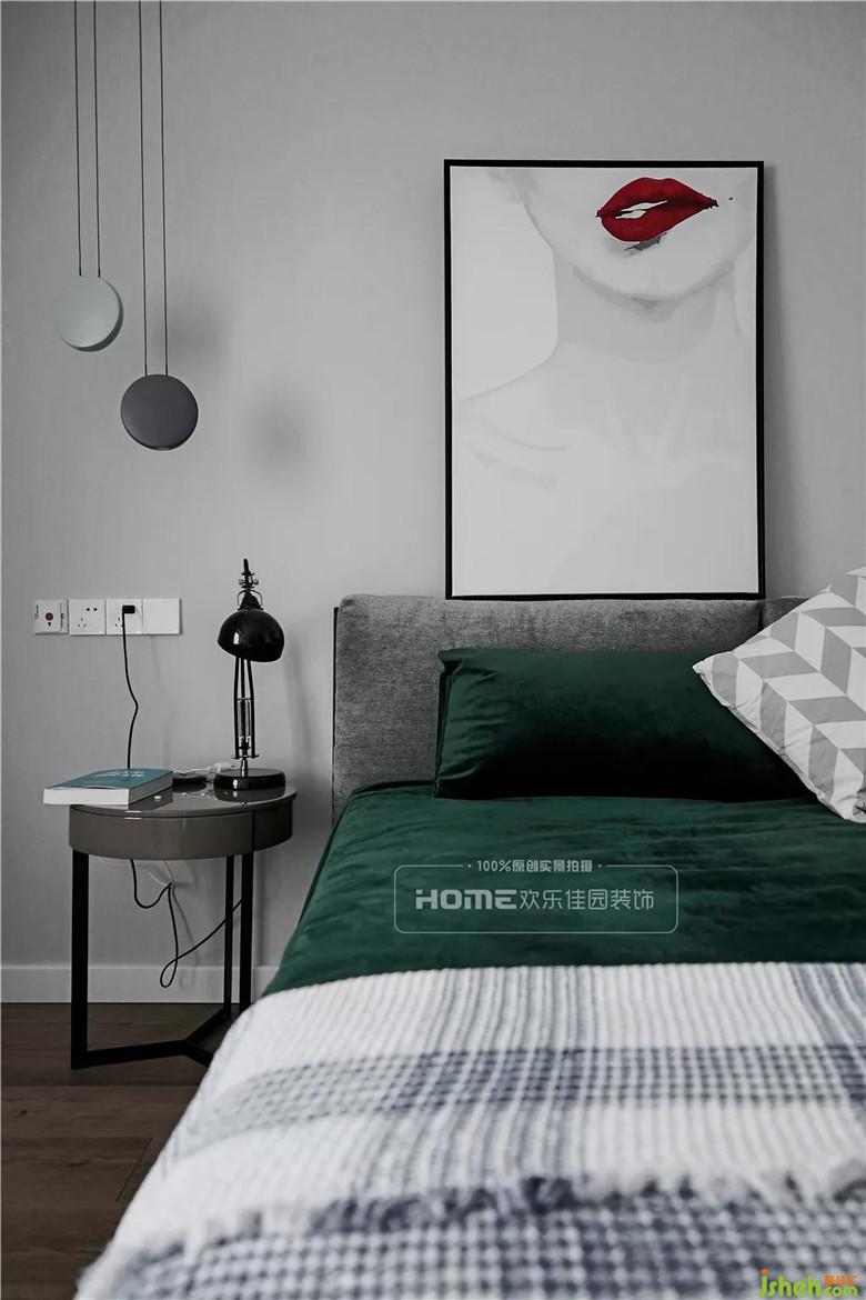 以簡潔的石膏板疊級線代替復(fù)雜的吊頂,以簡勝繁,從頂延直到床頭的照明燈,使室內(nèi)更具溫情。床品選擇穩(wěn)重的色調(diào)——墨綠色,活潑而富有朝氣,裝飾畫的大紅唇看一眼就讓人移不開眼睛。