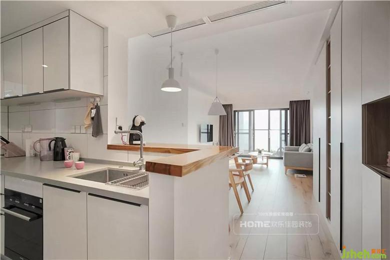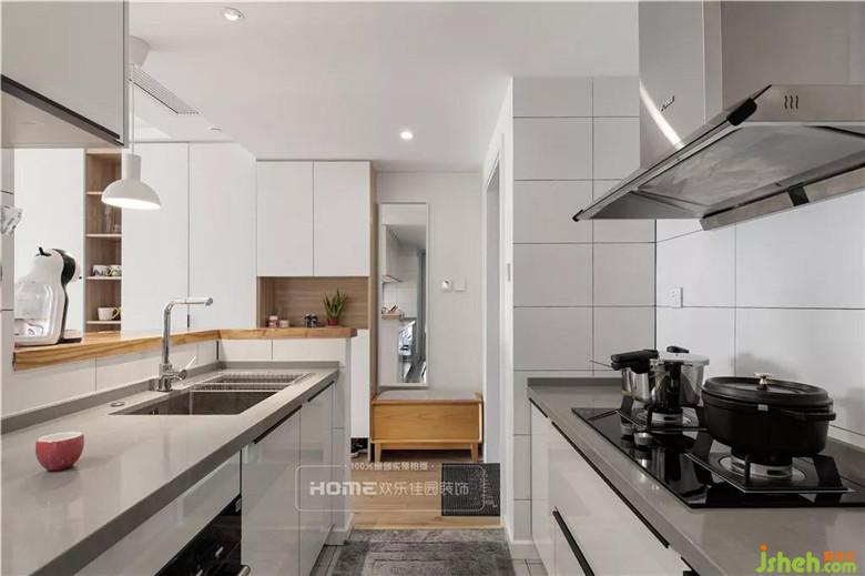 原廚房空間閉塞,導(dǎo)致入戶空間狹小且光線不足,考慮到S小姐喜歡簡潔、開闊的空間,設(shè)計師將原始櫥柜和餐廳的隔墻打開,設(shè)計成開放式廚房,通過釋放廚房的空間,增加入戶、餐廳的操作區(qū)域,顯得更加的明亮大氣。