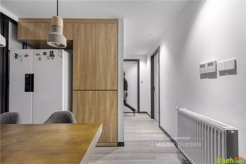 實木的餐桌搭配黑色鐵藝的桌腳,再輔以灰色布藝餐椅組合,在自然的氛圍下,木質(zhì)與灰色奏出和諧的樂章,定制的餐邊柜,預(yù)留冰箱擺放的尺寸,使空間產(chǎn)生撞色感,家具的自然過渡,簡約的設(shè)計顯得更加有家的味道。
