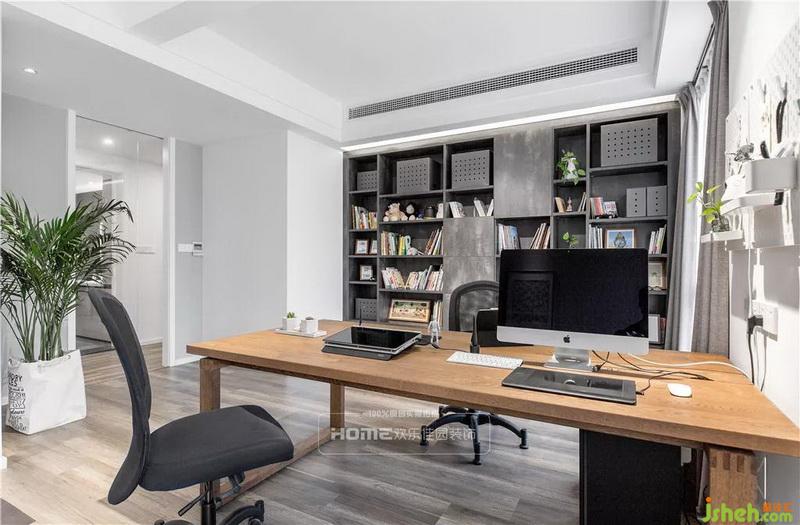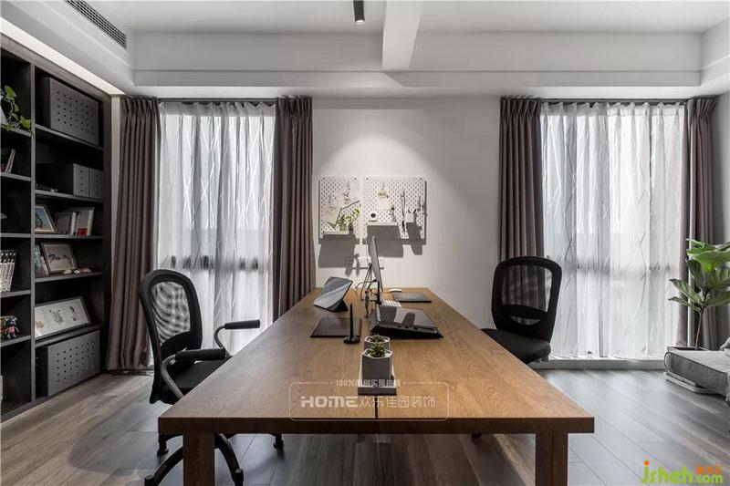 原書(shū)房的進(jìn)門(mén)位置影響著書(shū)房的布局,室內(nèi)設(shè)計(jì)師后期的改造上,將原書(shū)房的門(mén)封閉,在過(guò)道上重新規(guī)劃門(mén)洞,并在封閉的位置規(guī)劃一排到頂?shù)臅?shū)柜,設(shè)計(jì)師在窗戶中間置放書(shū)桌,保證倆人可以同時(shí)使用。
