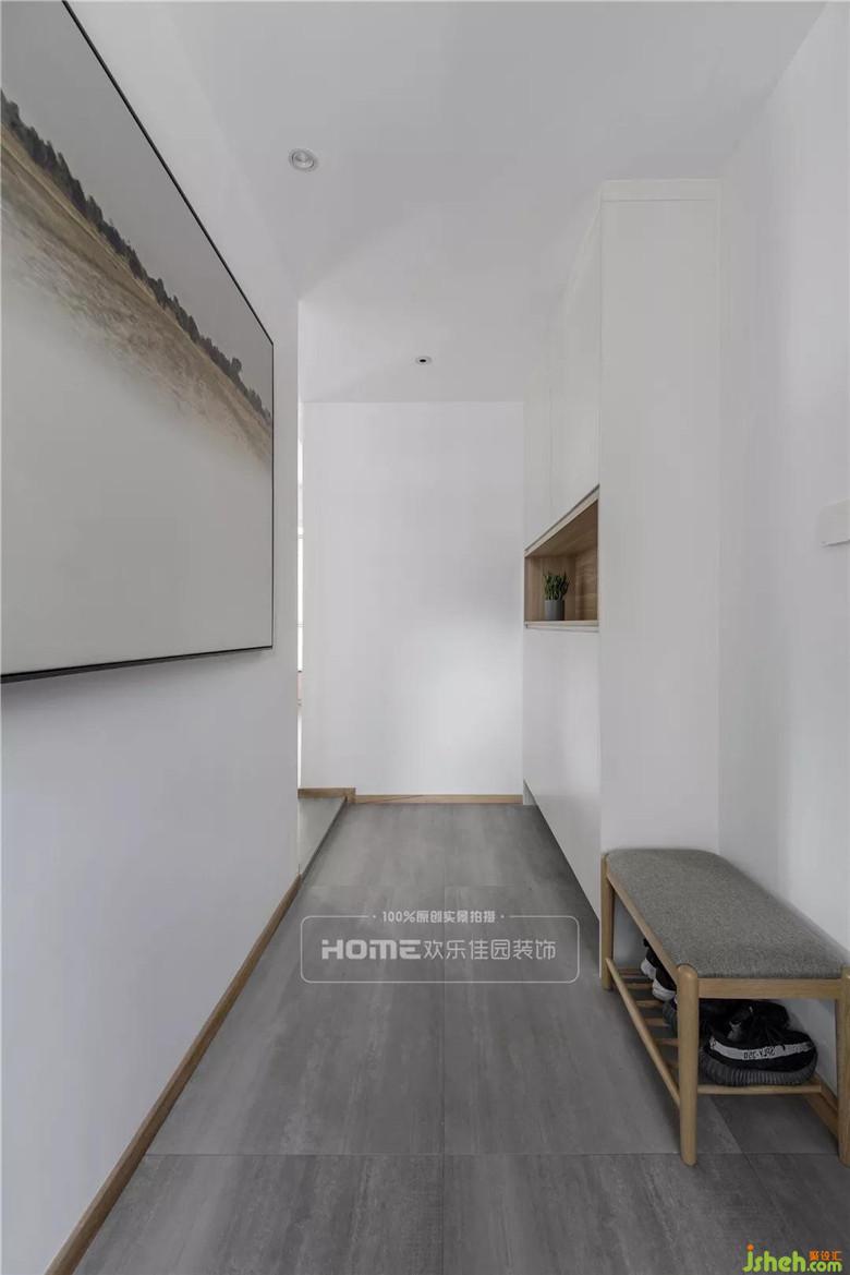 由于戶型是異形結構,入戶自然形成一個緩沖區(qū)域,簡單素雅的陳設,加之木質踢腳線、灰色地板平衡視覺,依稀可見的內里空間,有著“猶抱琵琶半遮面”的意境,透露著神秘與時尚感。