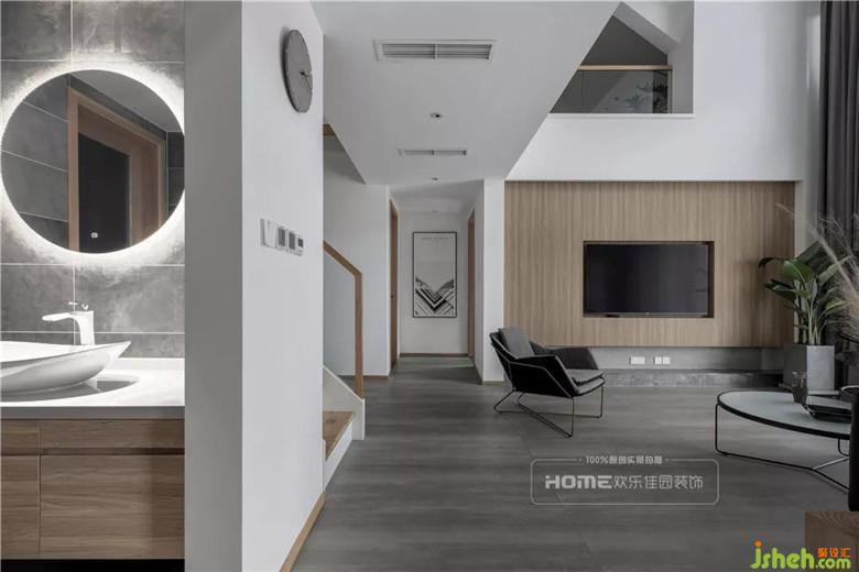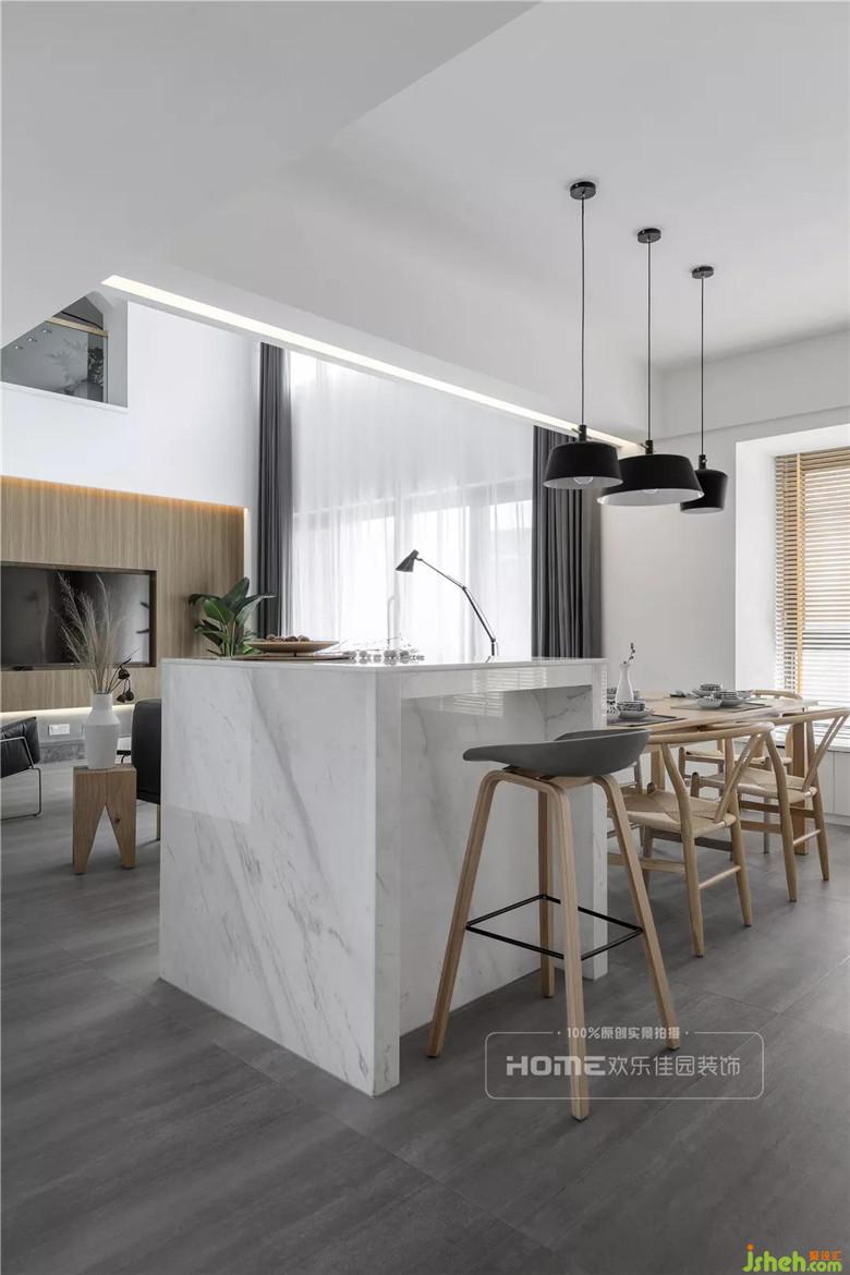 挑高戶型隔層下的空間作了餐廳和島臺的設計,與客廳相互連接和呼應,巧用家具劃分出空間功能,設計上保留了視覺的通透性,視角由餐廳島臺空間延伸至客廳,從而降低由于隔層帶來的壓迫感。
