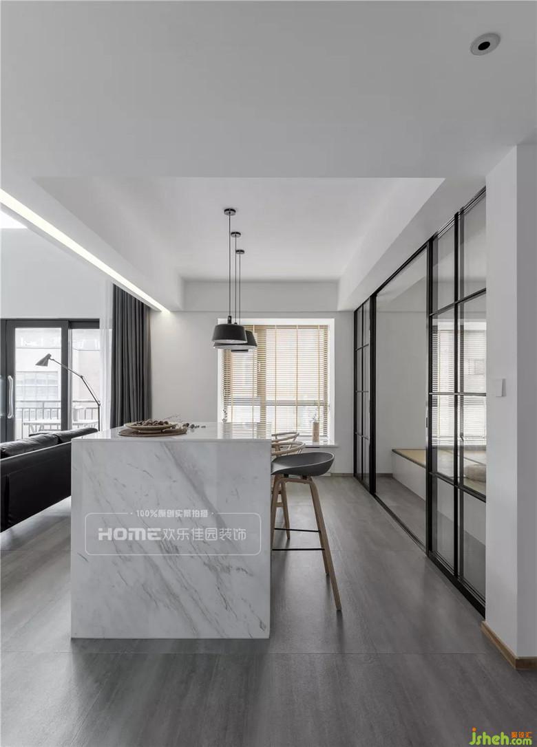 餐廳和書房整體相通,呈現(xiàn)出完全開放式的格局,充分利用黑框門,將兩個空間劃分,視覺空間更加開闊。長輩在茶室聊天喝茶、小孩在客廳嬉笑玩耍、大人在島臺忙碌備餐的情形一覽無余,沒有了墻體的分隔,整體空間大氣而流暢。