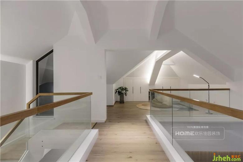 二樓空間通過設計師的重新打拆與布局,把光線引入、加入新風設備,把空間打開,形成合理的交通動線,規(guī)劃了兒童活動室和帶有書房的臥室。過廊設計了玻璃扶欄,視線毫無遮擋,讓樓上樓下的景觀融為一體。