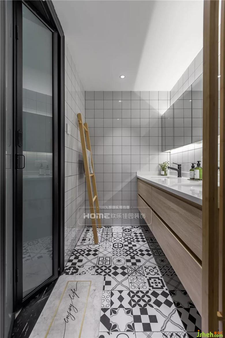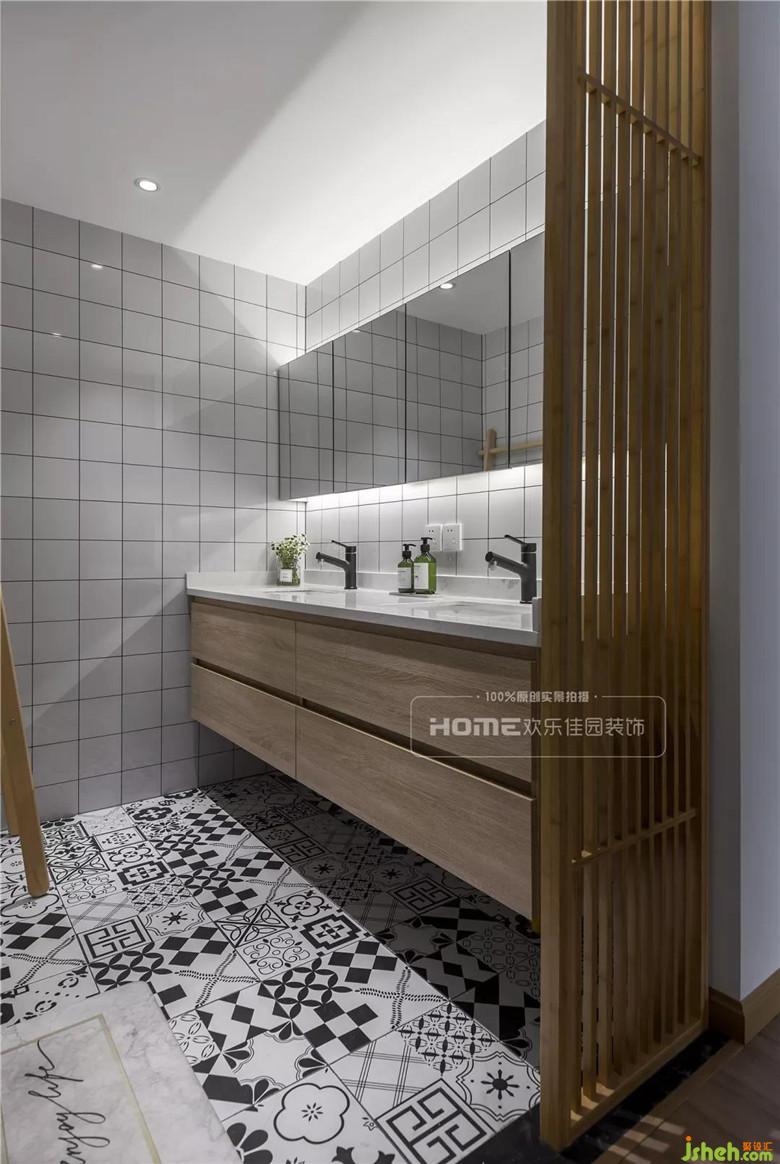 原房兩個(gè)衛(wèi)生間是緊挨著的,打通其中一個(gè)衛(wèi)生間的隔墻,劃分為獨(dú)立的洗漱區(qū)域,用復(fù)古的白磚與不規(guī)則圖案的花磚鋪貼墻面與地面,竹制的鏤空隔斷,半透明的效果,給空間增添一絲清幽感。